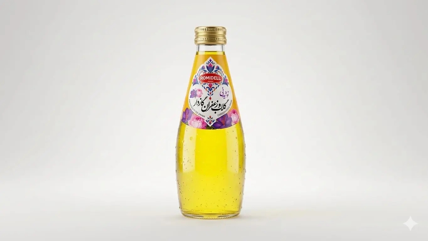 Romidel carbonated drink rose water and saffron flavor 290ml نوشیدنی گلاب و زعفران گازدار رومیدل